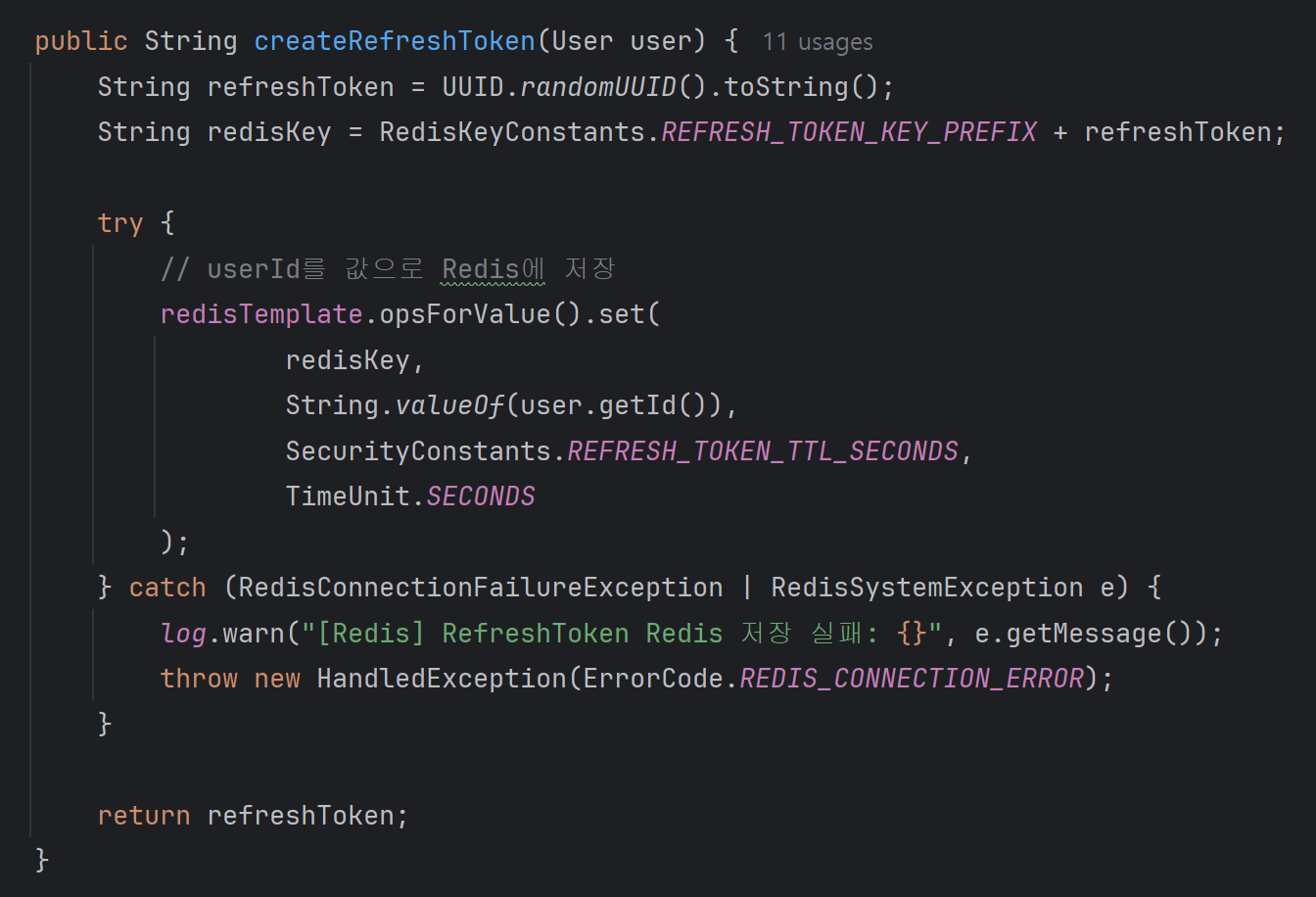 - Refresh Token도 JWT 형식으로 생성되며, userId를 값으로 Redis에 저장