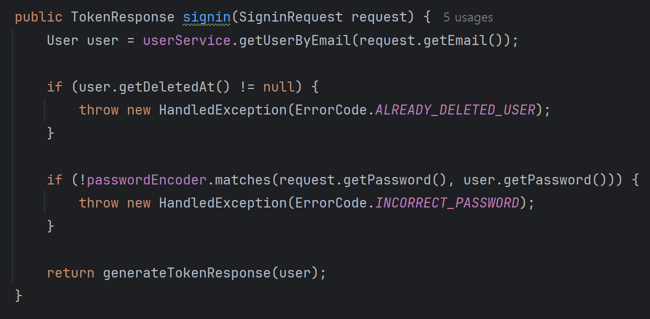 - 먼저 이메일로 사용자를 조회하고, 이미 탈퇴 처리된 사용자라면 예외를 발생시킨다. 즉, deletedAt 필드가 null이 아니라면 이미 탈퇴한 사용자로 간주한다.