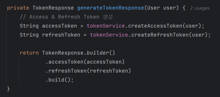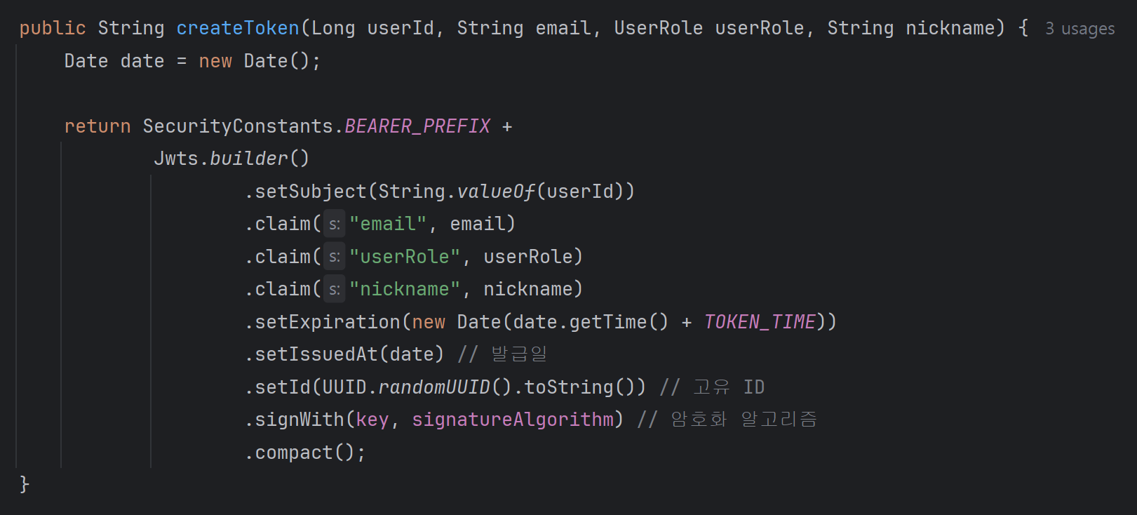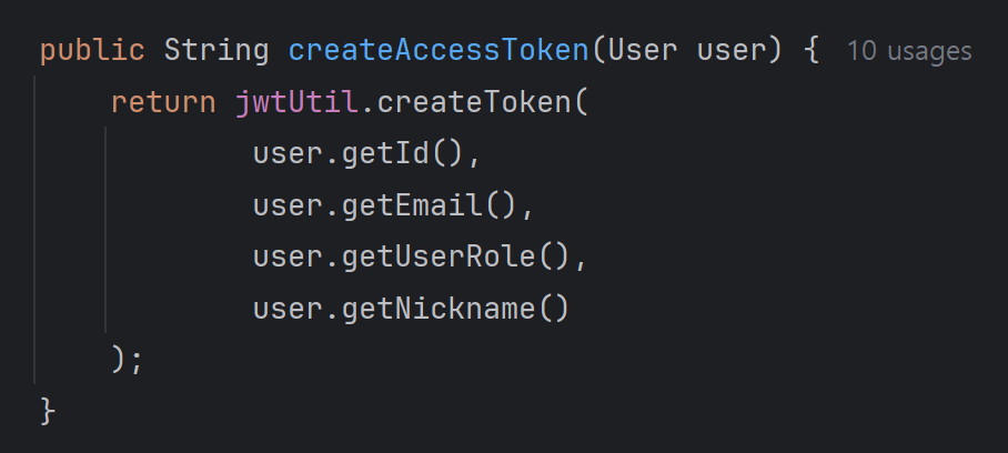 - JwtUtil.createToken() 메서드를 내부적으로 사용