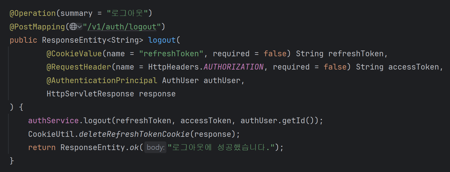 해당 요청은 아래 컨트롤러에서 처리된다. 로그아웃이 완료되면 클라이언트 측 쿠키를 삭제한다.