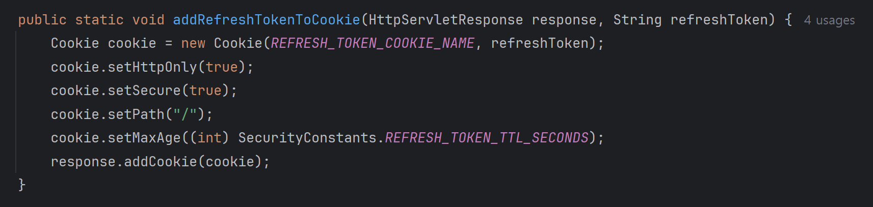 실제 코드에서도 Refresh Token은 HttpOnly + Secure 옵션을 명시했다. 이렇게 설정함으로써 자바스크립트 접근 차단과 HTTPS 연결 제한을 동시에 적용하고 있다.