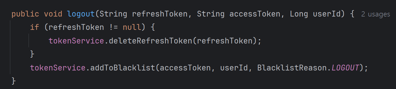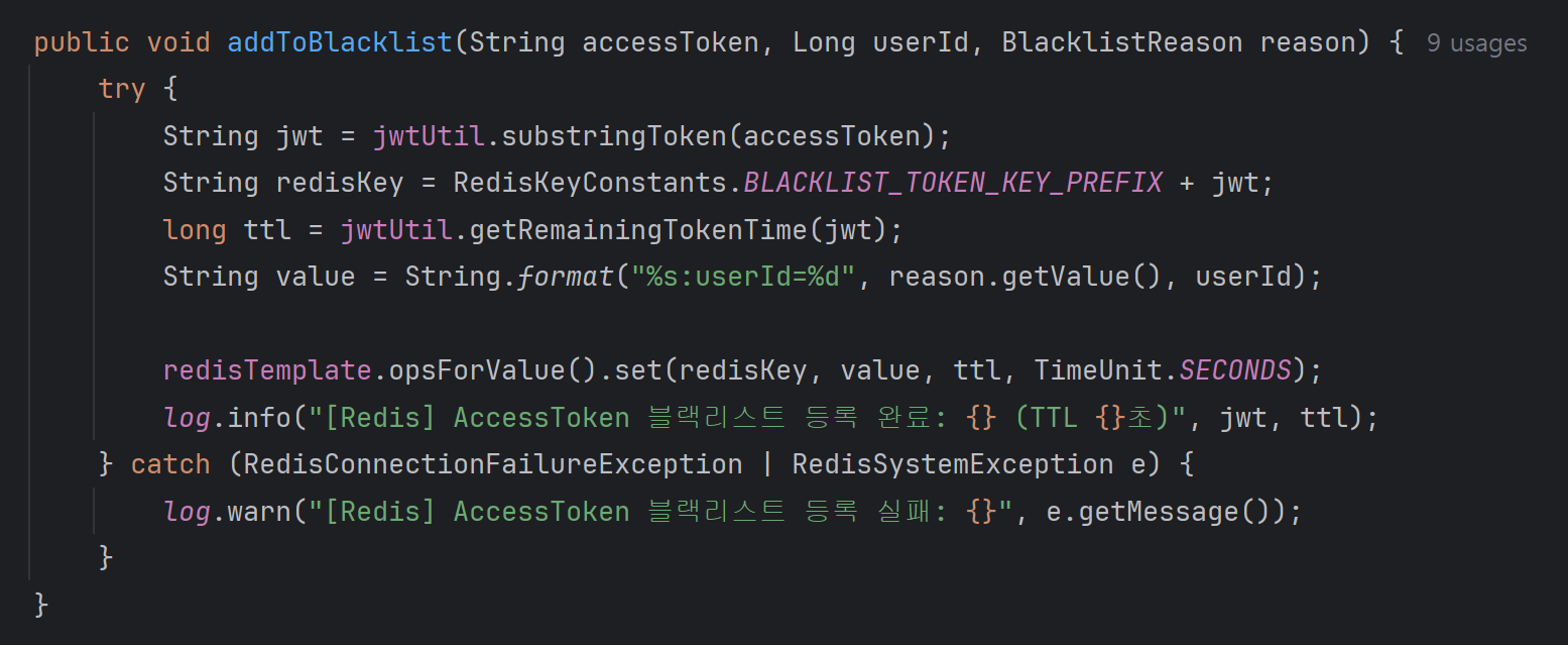 다음과 같이 토큰을 Redis에 블랙리스트로 등록하고, 남은 유효 시간만큼 TTL을 설정해 만료 전까지 서버에서 차단할 수 있도록 처리한다.