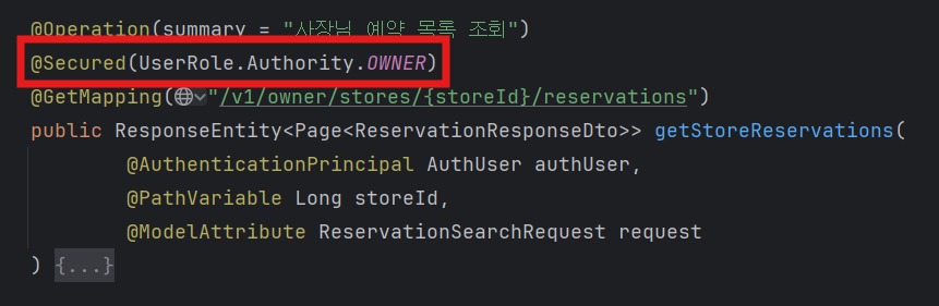 실제로 최종 프로젝트에서 인가 처리는 @Secured 어노테이션이 메서드 단위로 적용되어 있다.