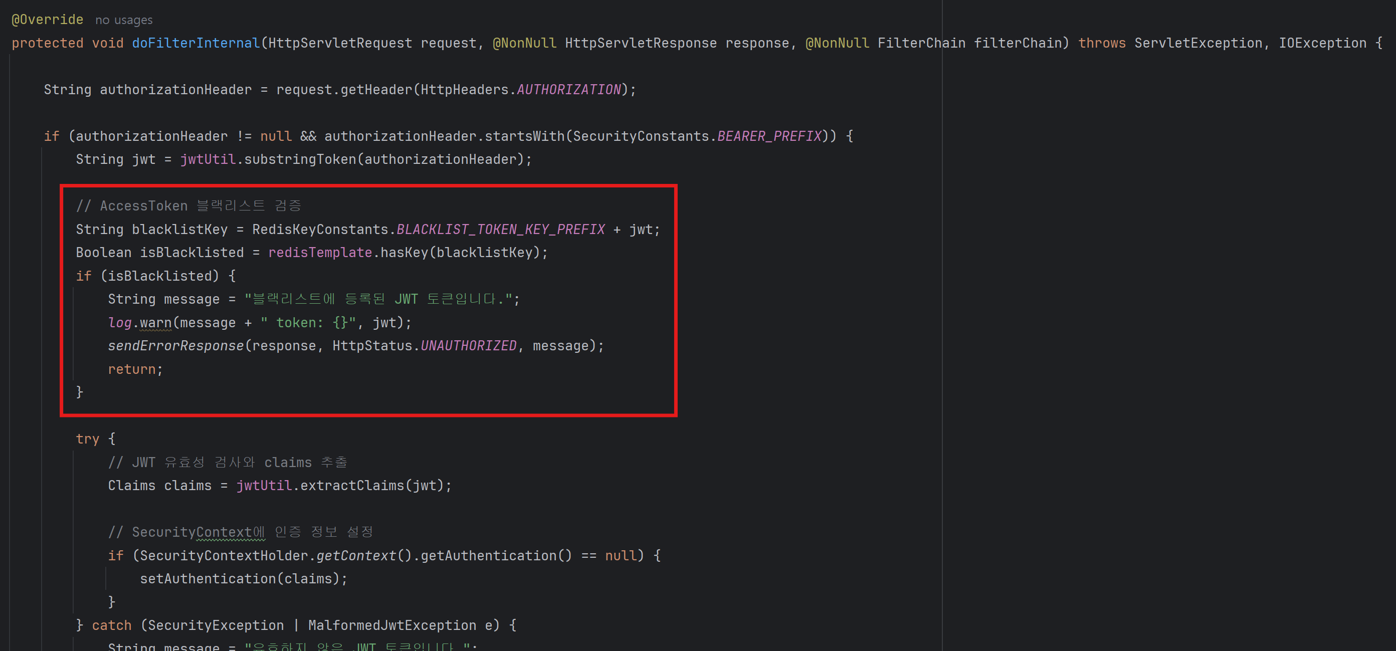 - Redis에 해당 토큰이 블랙리스트로 등록되어 있는지 조회