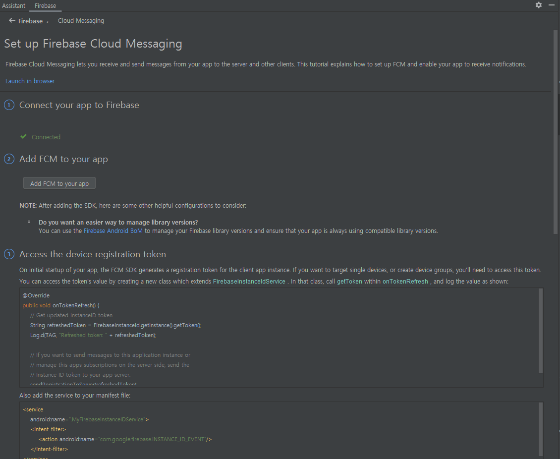 ๋ค์ ์ฝ๋๋ฅผ ๋ณต์ฌํด MainActivity์ OnCreate() ๋ฐ์ ๋ฃ๋๋ค. ํ์ด์ด๋ฒ ์ด์ค ์ฐธ๊ณ ๋ฌธ์์์ 'ํ์ฌ ๋ฑ๋ก ํ ํฐ ๊ฐ์ ธ์ค๊ธฐ'์์๋ ์ฝ๋๋ฅผ ๋ณต์ฌํ ์ ์๋ค.