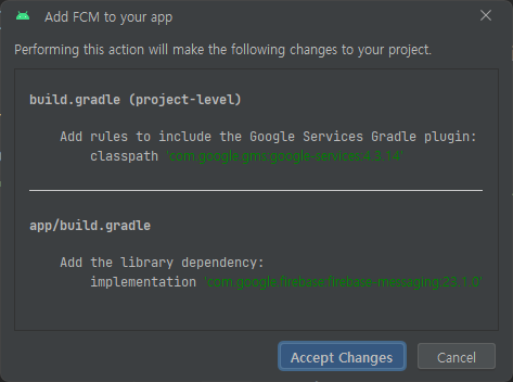 Firebase์ ํ๋ก์ ํธ๋ ์ฐ๊ฒฐ์ด ๋์ด์์ผ๋ฏ๋ก ์๋ตํ๊ณ , Add FCM to your app ๋ฒํผ์ ๋๋ฅด๋ฉด ์๋์ ๊ฐ์ ์ฐฝ์ด ๋ฌ๋ค. Accept Changes๋ฅผ ๋๋ฅด๊ณ ์ ์ ๊ธฐ๋ค๋ฆฌ๋ฉด ์๋ฃ๋๋ค.