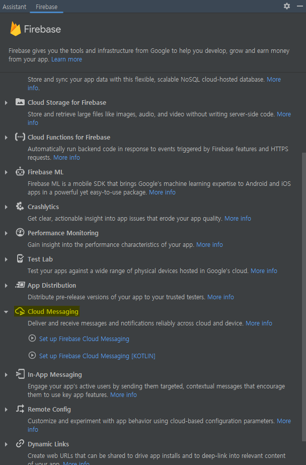 Tools - Firebase ์ ๋ค์ด๊ฐ์ Cloud Messaging - Set up Firebase Cloud Messaging์ ํด๋ฆญํ๋ค.