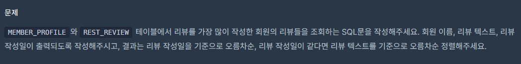 어려워서 답을 보고 푼 문제..다른 건 다 적어도 WHERE절에 있는 긴 서브쿼리는 못적었다.🥲윈도우 함수는 거의 써보지 않아서 생소하다. DENSE_RANK()는 동일한 순위를 하나의 건수로 취급하는 함수이다. 따라서 리뷰 수가 같은 경우에도 같은 순위로 취급한다. 최종적으로는 REVIEW_RANK가 1인 회원의 MEMBER_ID를 선택한다.