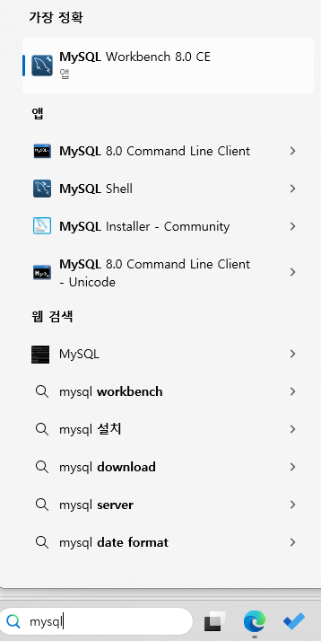 이제 MySQL Command Line도 사용할 수 있다. 아래 검색창에서 mysql을 검색해 MySQL Command Line을 열어준다.