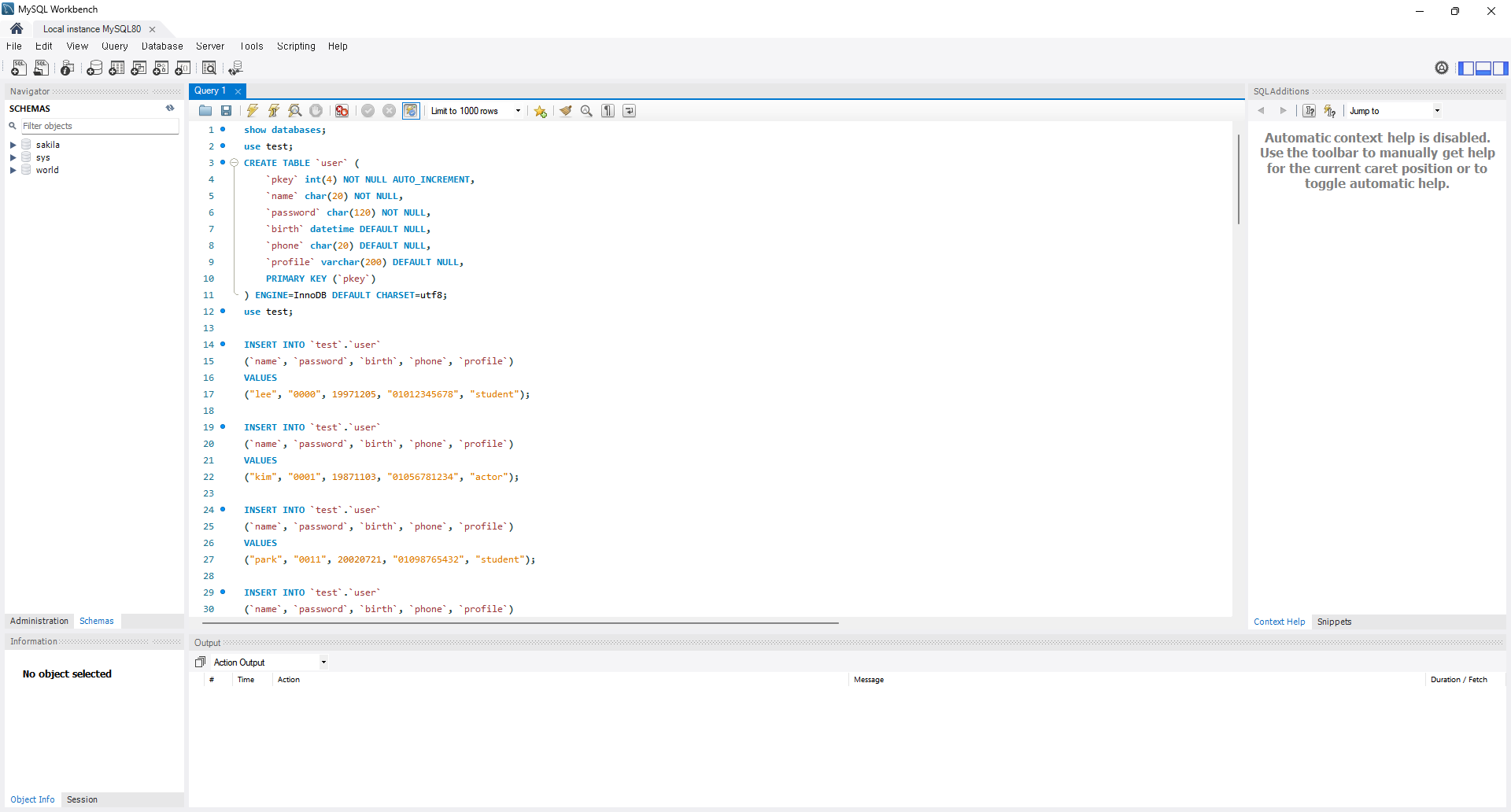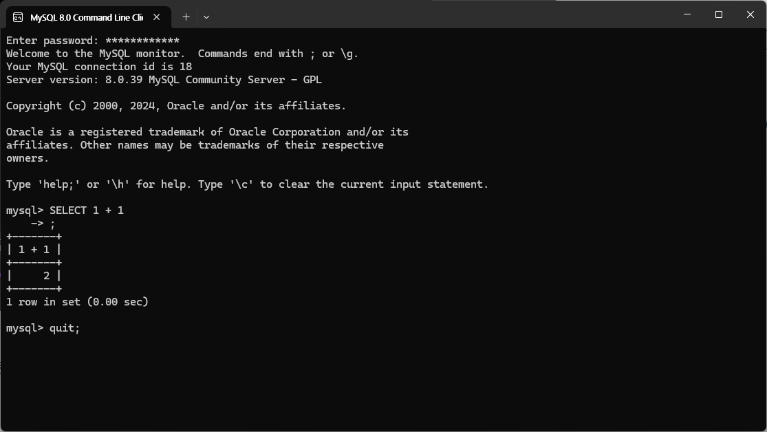 처음 열면 Enter password 라는 문구가 보인다. 아까 입력한 비밀번호를 입력하면 된다. command line에 SELECT 1 + 1을 입력해 단순한 계산을 해보았다. 나갈 때는 quit;을 입력하면 창이 꺼진다.
