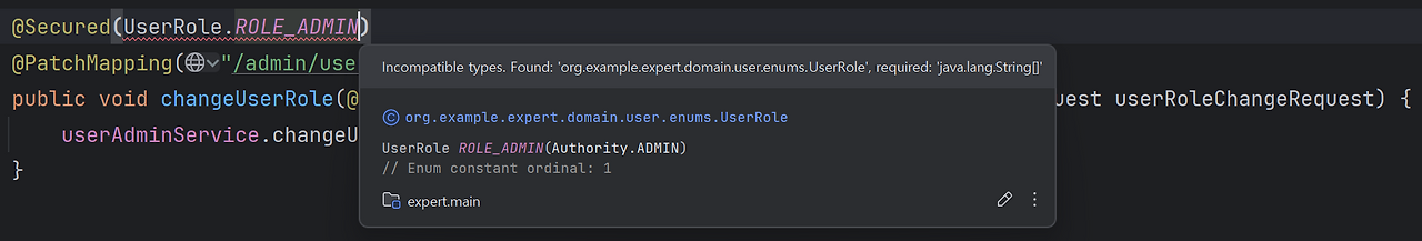 다음은 @Secured 안에 enum을 넣었을 때 호환되지 않는 타입이라고 에러가 발생하는 모습이다.